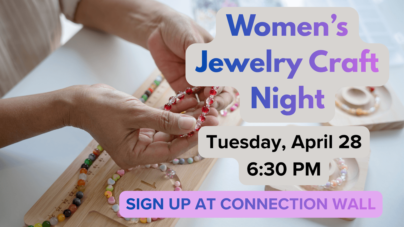 - April 28: Jewelry Craft, 6:30 pm Community Room. Supplies are provided. Sign up on Connection Hub bulletin board.